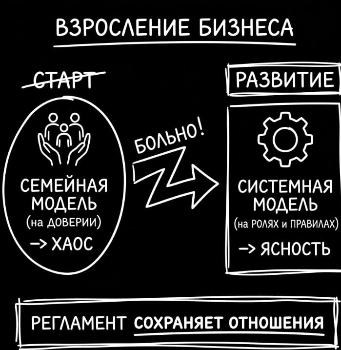 На старте бизнеса мы часто живем в “семейной модели”. Все рядом. Все про все знают. Решения принимаются быстро. Правила устные. И это нормально. Но потом система взрослеет. И наступает момент, когда “по-семейному” уже не работает. А мы пытаемся продолжать. Это тот самый переход по спиральной динамике. От “мы команда героев” к “мы система”. От “держится на доверии” к “держится на ролях и правилах”. Он всегда болезненный. Потому что регламенты начинают восприниматься как недоверие. Как контроль. Как бюрократия. И я тогда тоже так воспринимал. Мне казалось, что если мы начнем фиксировать правила, мы потеряем скорость и дух. А на практике мы начали терять другое. Мы начали терять ясность. Когда нет правил, каждый начинает тянуть на себя. Не из злого умысла. А потому что так проще выжить в неопределенности. И постепенно рождается хаос, который разъедает отношения. Регламенты нужны не потому что мы “любим правила / бумажки”. А потому что мы выросли. И старый способ управления больше