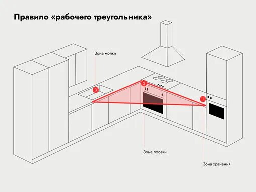 Рабочий треугольник — это принцип эргономичного расположения трех ключевых зон на кухне: плиты, мойки и холодильника. Эти зоны должны быть организованы так, чтобы образовывать треугольник с приблизительно равными сторонами. Это помогает минимизировать ненужные движения и делает процесс готовки более удобным. Основные советы для разных типов кухонь: В однорядной кухне рабочий треугольник невозможно реализовать в классическом виде. В этом случае важно расположить зоны в правильной последовательности: холодильник → мойка → плита. Между ними должно быть достаточно рабочей поверхности, чтобы обеспечить комфорт. Это наиболее подходящий вариант для рабочего треугольника. Расположите холодильник, мойку и плиту на разных сторонах угла, сохраняя между ними равномерное расстояние. Оптимальная длина каждой стороны треугольника — от 1,2 до 2,7 метров. В этом случае рабочий треугольник можно удобно организовать, разместив каждую зону на своей стороне "буквы П". Например, холодильник — на одной сторо