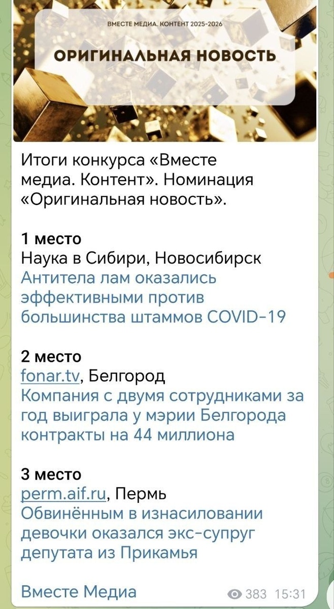 🌾 🥈Материал «Фонаря» с заголовком «Компания с двумя сотрудниками за год выиграла у мэрии Белгорода контракты на 44 миллиона» занял второе место на ежегодном профессиональном конкурсе «Вместе медиа. Контент». Редакция вошла в тройку лидеров в номинации «Оригинальная новость». Первое место присудили новосибирскому изданию «Наука в Сибири» за материал «Антитела лам оказались эффективными против большинства штаммов COVID-19». На третьем месте оказался пермский perm.aif.ru с новостью «Обвинённым в изнасиловании девочки оказался экс-супруг депутата из Прикамья». ✨«Вместе медиа. Контент» — ежегодный профессиональный конкурс для журналистов, авторов и медиапроектов. Жюри оценивает работы в разных форматах: аудио, видео, текст, мультимедиа. При отборе учитывают качество, вовлекаемость, оригинальность и креативные форматы, включая использование искусственного интеллекта. 🔦Поддержать «Фонарь» можно здесь.