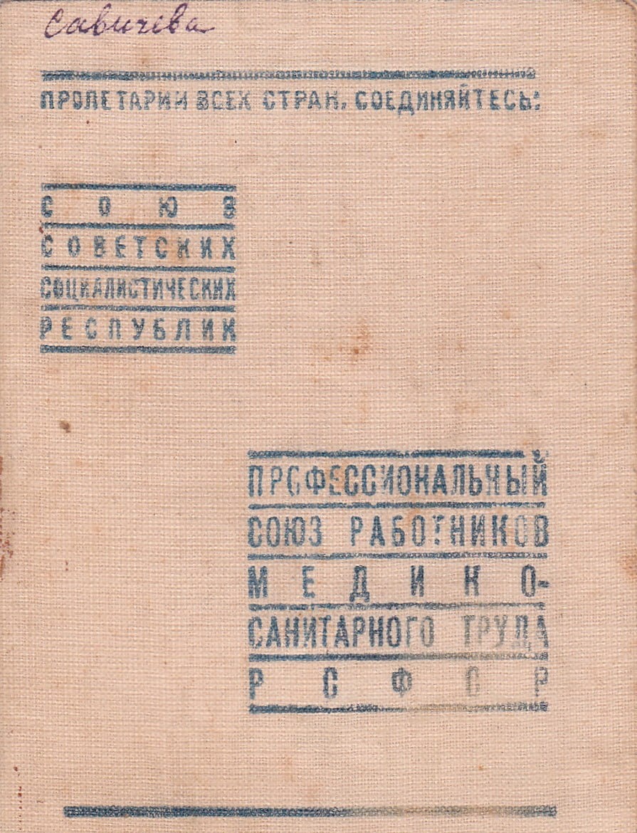 Членский билет выданный санитарке поликлиники Октябрьской железной дороги Савичевой Елене Дмитриевне в том что она является членом