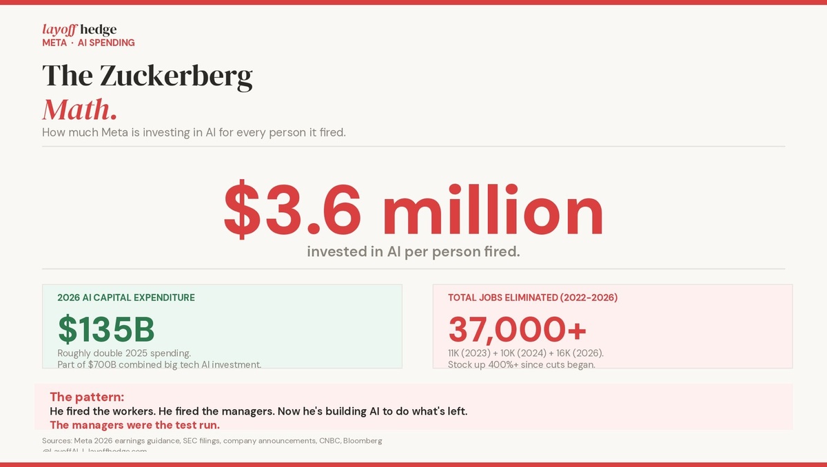 ». С 2022 года он уже убрал 37 000 таких «уровней». На самом деле — это были люди. И, по мнению экспертов (в том числе меня 😄), в этом году под сокращение могут попасть ещё тысячи. Планируемые инвестиции Цукерберга в AI в 2026 — $135 млрд. Это примерно $3,6 млн на каждого уволенного. #нейросети · @larchanka