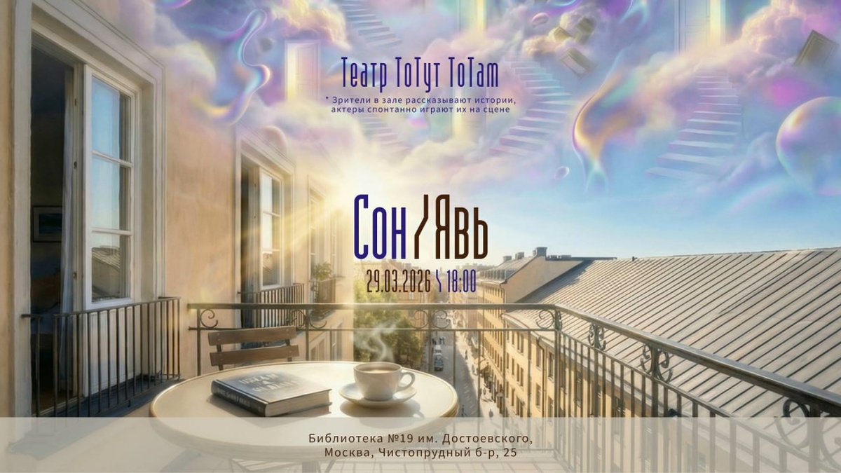 Плейбэк театр ТоТут ТоТам в перфомансе «СОН/ЯВЬ» Начало в 18:00 Спите ли вы, чтобы бодрствовать, или бодрствуете, мечтая наконец заснуть? Какой ваш самый любимый сон и почему? А как насчет вещих снов или кошмаров? Вообще какие у вас взаимоотношения со сном и явью? Мы готовы превратить любые ваши мысли и воспоминания на эту тему в театральные пьесы здесь и сейчас. Приходите! Адрес: Москвка, Чистопрудный бульвар, 25 Библиотека им. Достоевского Билеты: 1000 рублей При покупке от двух - скидка 20% Регистрация по ссылке #ТоТутТоТам #Перформанс #Россия