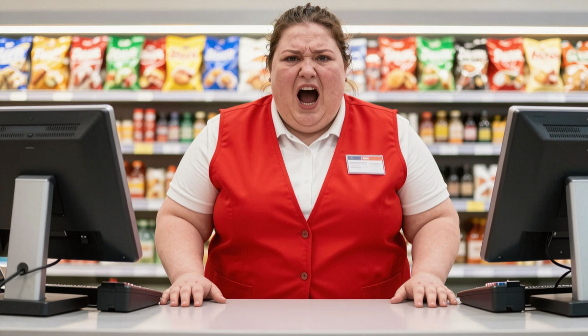 Но она будто не слышала. Продолжала махать руками и что‑то недовольно бормотать. Самое странное было то, что товары лежали на ленте, а она даже не пыталась их пробивать. Время шло, позади нас начала скапливаться очередь. Люди поглядывали на нас с недоумением, кто‑то тихо переговаривался.