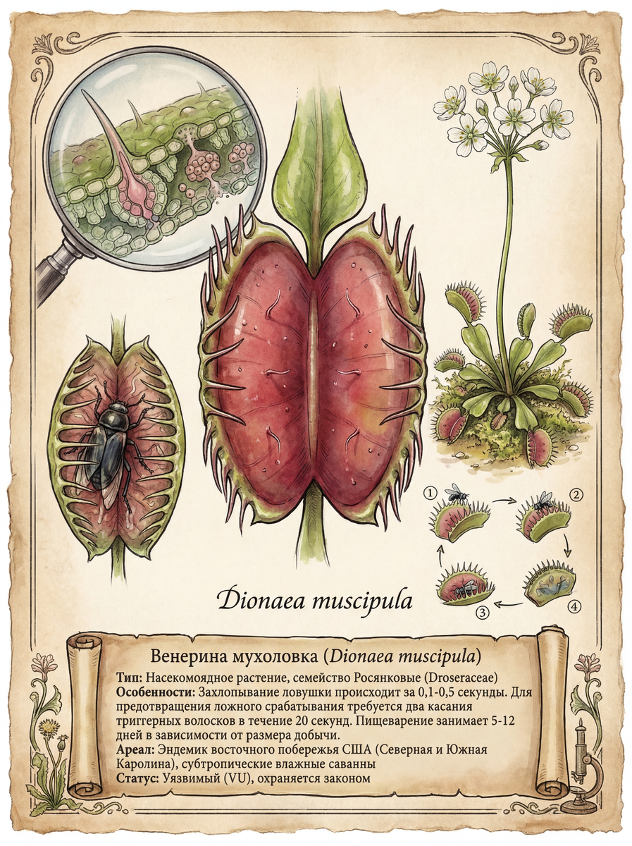 Венерина мухоловка — это не просто растение. Это инженерное чудо эволюции. Её листья превратились в ловушки с чувствительными волосками-триггерами. Две половинки, похожие на раскрытую пасть, по краям — острые зубцы, которые сцепляются, когда ловушка захлопывается. Внутри — красноватый оттенок, который привлекает насекомых, принимающих его за цветок.