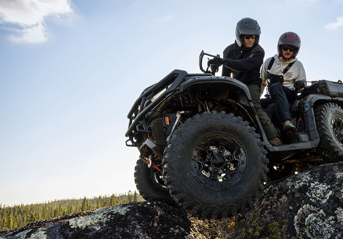 Колёса — отдельная тема. На Outlander Backcountry стоят 14-дюймовые легкосплавные диски с бэдлоками. Для тех, кто не в курсе: бэдлоки — это такие кольца на болтах, которые жёстко прижимают край шины к диску. Это позволяет ехать на очень низком давлении, не боясь, что покрышка разбортируется в колее. А резина тут серьёзная — 30-дюймовые XPS Iron Force. Массивные, злые, готовые грызть любую поверхность.