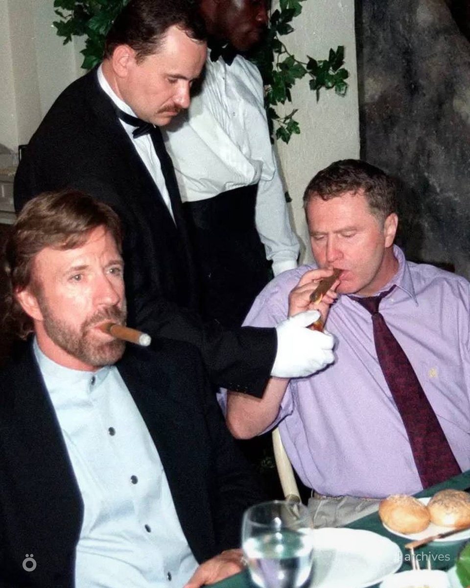 1997 год — Чак Норрис и Владимир Жириновский на неформальной встрече в ресторане «Беверли Хиллз» в Москве.