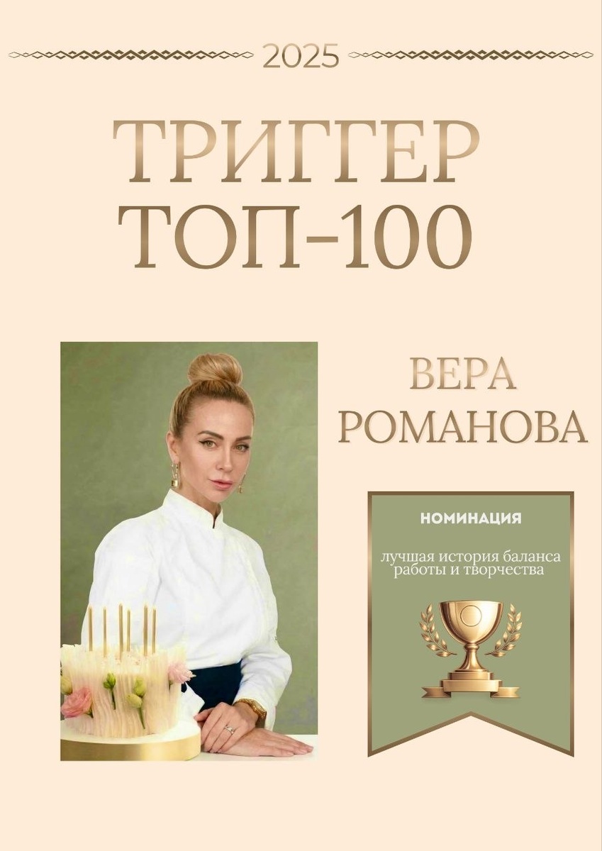 Мы привыкли думать, что успех — это либо карьера 24/7, либо уход в «свободное творчество» сжигая мосты. Вера Романова ломает этот стереотип. Именно поэтому она получает номинацию «Лучшая история баланса работы и творчества 2025» в нашем ТОП-100. 🌜 Мы отмечаем Веру не только за безупречные десерты, а за умение показывать, что эстетика и порядок в жизни доступны каждому. Ее история — это про «маленькие победы» над хаосом, про осознанность и про то, как структура работы может давать свободу вдохновению. 💛Вера доказывает: чтобы обрести гармонию, не нужно менять профессию — достаточно выделить пространство для творчества. Совсем скоро выйдет статья, в которой мы подробно расскажем о пути Веры, ее философии баланса и о том, как выпечка стала для нее личным пространством тишины и восстановления. Следите за новостями! 🔔