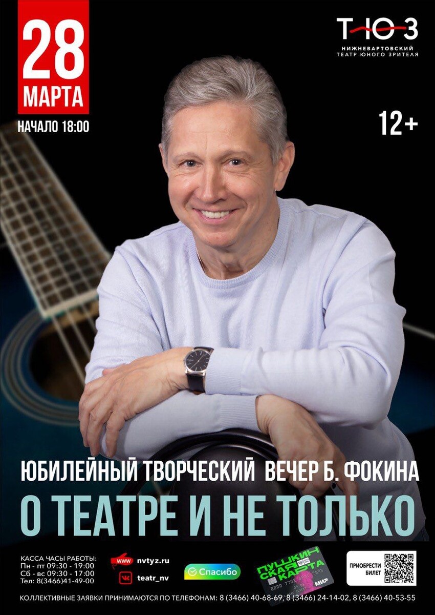 и бессменного заведующего музыкальной частью Нижневартовского театра юного зрителя. 🎉 Юбилейный вечер Бориса Фокина «О театре и не только» 📅 28 марта | ⏰ 18:00 📍 ТЮЗ Нижневартовска 🎟 Билеты: https://nvtyz.ru/spektakli/o-teatre-i-ne-tolko 👉 Успейте забронировать — будет трогательно и по-настоящему по-домашнему.