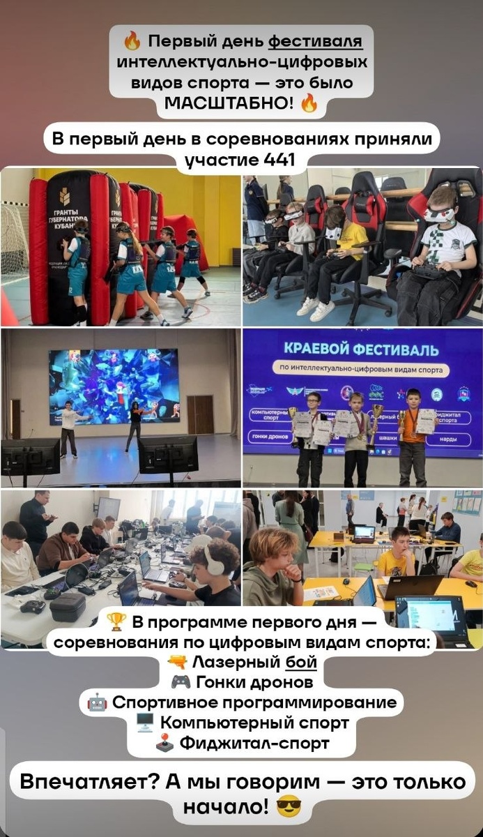 ! 🔥 Центр «ШАБРИ» выступил организатором совместно с невероятно крутой командой Регионального центра спортивной подготовки — и мы точно попали в точку! 💥 В первый день в соревнованиях приняли участие 441 спортсмен из: 📍 Ростовской области 📍 Республики Адыгея 📍 Республики Крым 📍 7 муниципальных образований Краснодарского края Впечатляет? А мы говорим — это только начало! 😎 🏆 В программе первого дня — соревнования по цифровым видам спорта: 🔫 Лазерный бой — меткость и реакция! 🎮 Гонки дронов — скорость и управление! 🤖 Спортивное программирование — битва умов! 🖥️ Компьютерный спорт — стратегия и точность! 🕹️ Фиджитал-спорт — синтез классики и цифры!