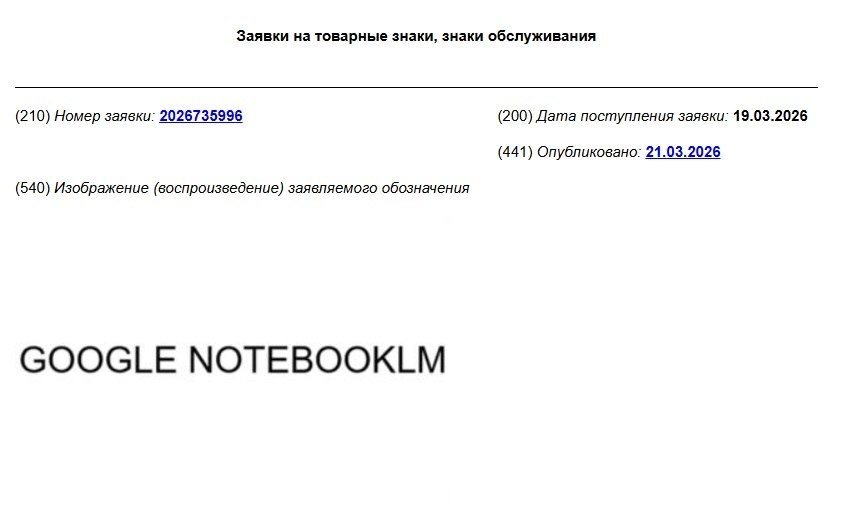 В Роспатент поступила заявка на регистрацию товарного знака Google NotebookLM. Ознакомиться с ней можно здесь. Заявка поступила 19 марта. Заявителем выступает юридическое лицо «Гугл ЭлЭлСи» из США. В списке товаров и услуг, которые хотят защитить исключительным правом, указываются загружаемое программное обеспечение для компьютеров и мобильных устройств, чат-боты, ИИ-инструменты и тому подобное. В открытых источниках отмечается, что NotebookLM — это ИИ-помощник для бизнеса, который помогает анализировать данные и проводить исследования на основе предоставленных источников. Кроме этого, он может превращать информацию в аудиопересказы, чтобы пользователи могли слушать их и учиться прямо на ходу. 📸 Скриншот из базы Роспатента RuHard в MAX | RuHard в VK | RuHard в Дзен | Максим Горшенин в VK