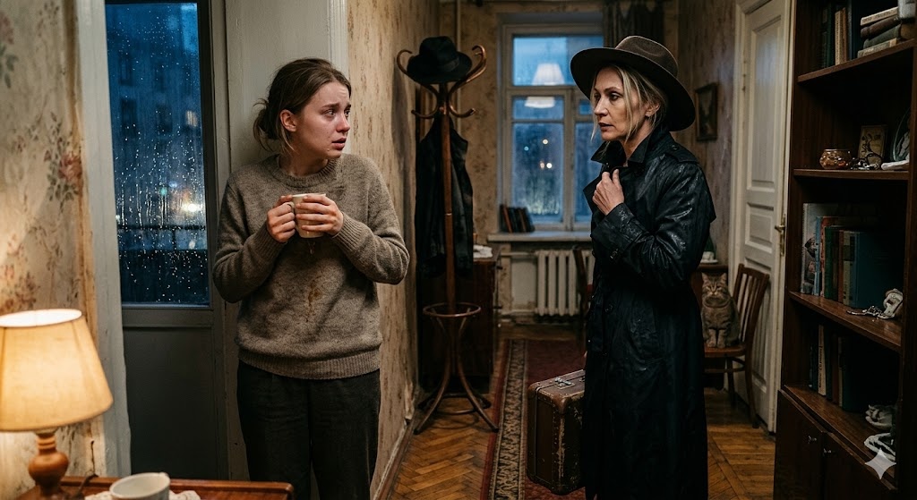 Лена подошла к двери и заглянула в глазок. На лестничной клетке стояла женщина в промокшем, но явно дорогом плаще. Из-под полей шляпы выбивались светлые пряди. Лицо казалось смутно знакомым, но мозг отказывался сопоставлять черты из далекого прошлого с реальностью. Лена повернула замок.