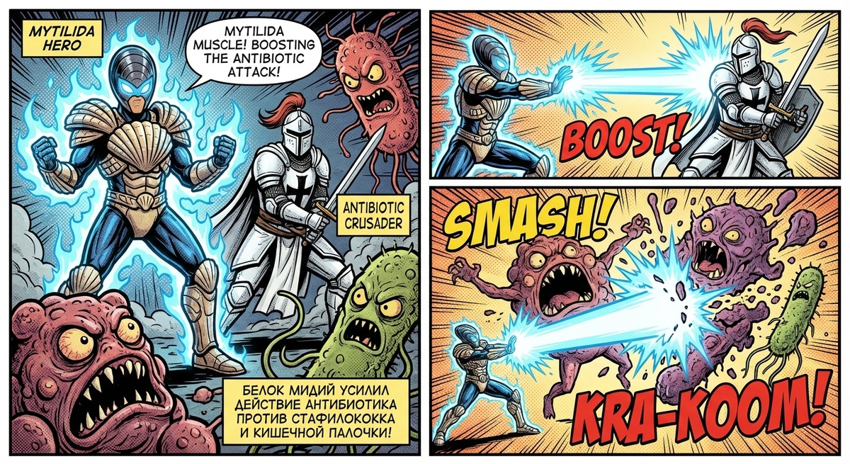 Белок, содержащийся в мидиях, повысил эффективность антибиотика в борьбе с бактериями стафилококка и кишечной палочки.