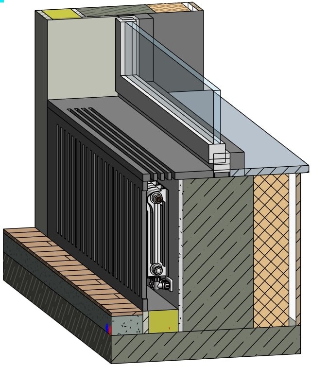 Мы как инженеры конечно ругаемся на "кухнях" на такие решения, но иногда против красоты, как говорится, не попрёшь ) Вот основные правила, которые нужно соблюдать, чтобы спрятать отопительный прибор за экраном: 1. Экран и подоконник должны иметь прорези для конвекции воздуха. 2. Отопительный прибор должен иметь на 20-25% бОльшую теплоотдачу, чем без экрана. 3. Расстояние от передней части отопительного прибора до стенки экрана должно быть минимум 20 мм. 4. Управление теплоотдачей должно быть с выносным датчиком температуры, или ручное. Размещать термоголовку с жидкостным элементом за экраном нельзя, т.к. внутри экрана образуется локальный перегрев, и терморегулятор будет перекрывать подачу теплоносителя раньше времени. Пару слов про управление теплоотдачей. Есть несколько вариантов: - ручной вентиль на отопительном приборе, а лучше на коллекторе, т.к. лазить периодически за экран не удобно; - термоэлектрический привод на отопительном приборе или на коллекторе, и настенный терморегу