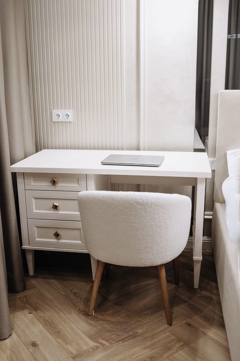 Рабочий стол от BRUS DECOR — пример такого подхода. Он сочетает в себе функциональность и визуальную лёгкость, благодаря чему легко вписывается в спальню, гардеробную