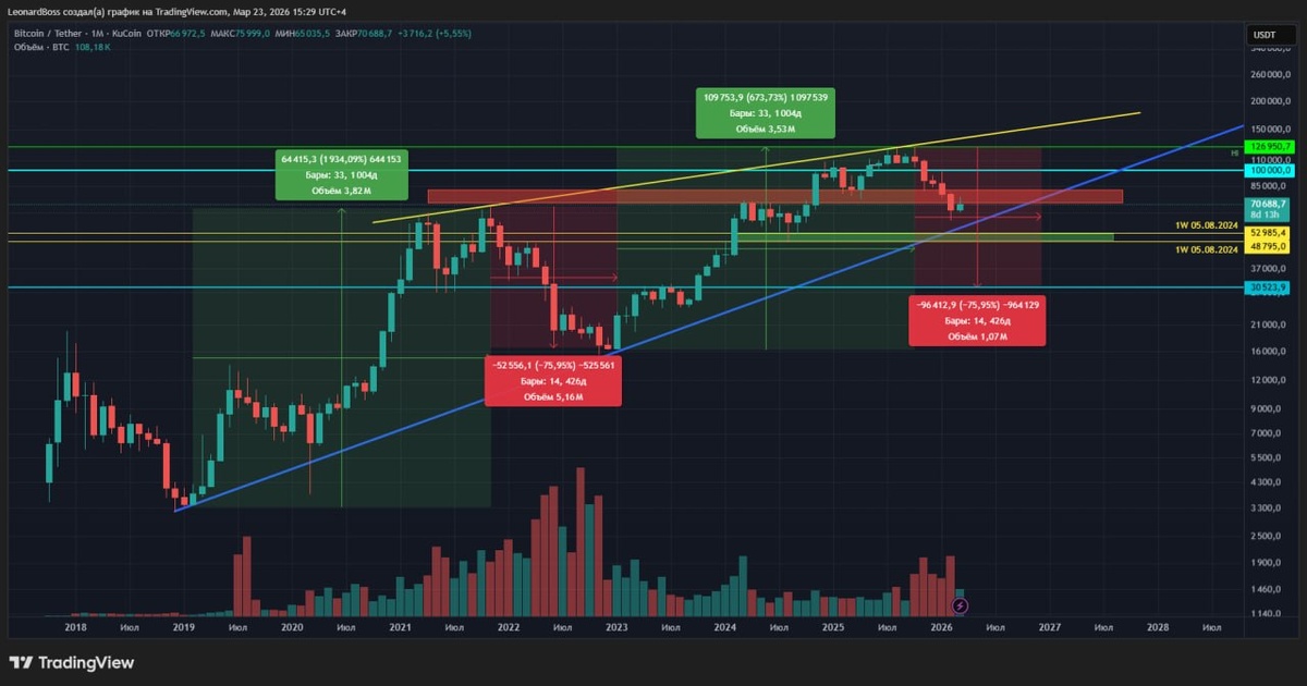🕯 ❓ Уже финиш или разгон перед прыжком в пропасть ❓ Коллеги, делюсь некоторыми наблюдениями по глобальной картинке BTC, как всегда без фантазий, теории заговоров, манипуляций и т.д. Для вашего удобства очередная легкая и понятная разметка с парой тройкой важных деталей и уровней, за которыми необходимо следить ближайшие дни!! ‼️ Итак, друзья, обратите внимание, месячный ТФ = глобальный из глобальных для понимания вероятного движения на ближайшие месяцы. Из ярко выраженного: трендовые линии сопротивления и поддержки, блок сопротивления над головой, ключевой блок поддержки + временные исторические периоды!! P.s. все эти моменты необходимо собирать в один комплекс, поскольку у них достаточно много общих точек соприкосновения в истории, разъяснять детали не буду. это долго, кому интересно, тот без особого труда рассмотрит! 1️⃣ Итак, видим 2 крайних исторических цикла роста, которые по таймингу имеют идеальное совпадение до точки наступления глобальной коррекции. В обоих циклах рост з