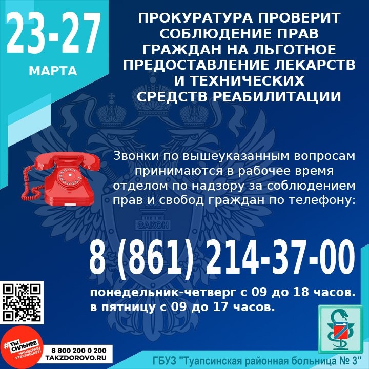 ⚡ С 23 по 27 марта текущего года Прокуратурой Краснодарского края будет проведена «горячая линия» для обращений граждан о нарушении прав на льготное предоставление лекарств, технических средств реабилитации. ☎️ Звонки по вышеуказанным вопросам принимаются в рабочее время отделом по надзору за соблюдением прав и свобод граждан по телефону: 📞 8 (861) 214-37-00 ➡️ понедельник-четверг с 09 до 18 часов. ➡️ в пятницу с 09 до 17 часов.