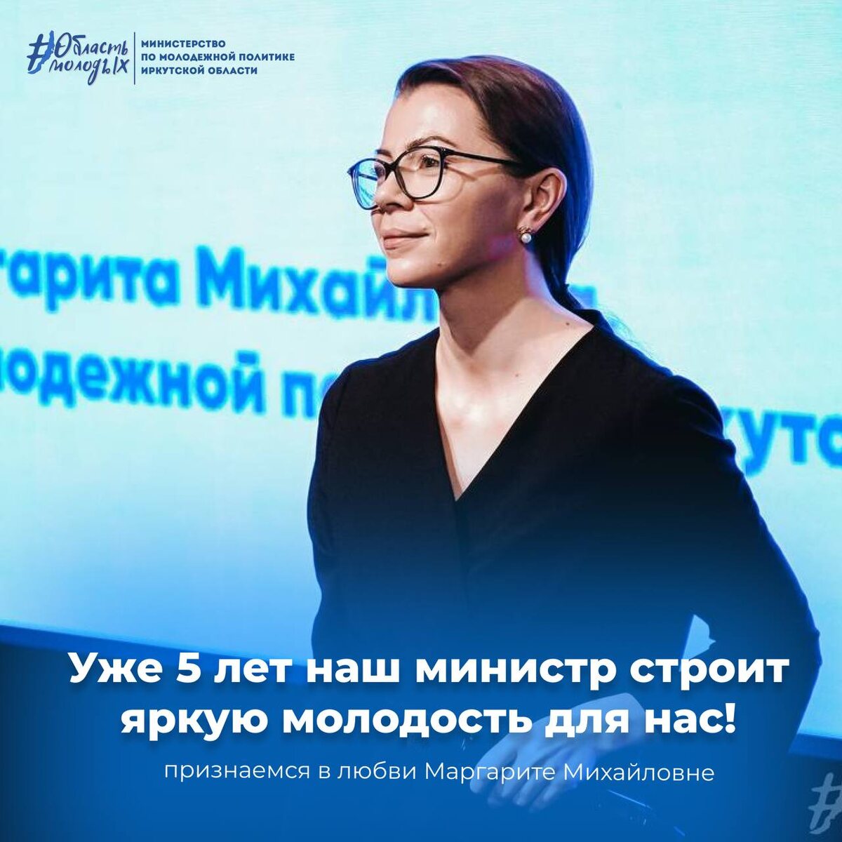 ? 🔹 5 лет быть на связи 24/7. 🔹 5 лет говорить и вдохновлять на разных языках (от зумерского до официально-делового). 🔹 5 лет верить в лидерство и потенциал каждого молодого жителя Иркутской области. Вчера, 22 марта у нас появился повод вспомнить и поблагодарить нашего министра за 5 лет работы с нами, молодежью Иркутской области! Маргарита Михайловна, спасибо за то, что вы всегда рядом: на форумах, на стройках студотрядов, на разборах наших проектов, на совещаниях по самым важным для нас вопросам. Вы прошли с нами эти 5 лет так активно, что наше молодежное сообщество стало больше, ярче и смелее. Пусть следующие годы станут новыми прорывами. А мы постараемся, чтобы вам было чем гордиться! Давайте реализуем еще сотни совместных проектов и поставим новые цели. Спасибо вам за поддержку! И как вы сами не раз говорили, дальше - больше! 🩵 ▫️ Подписывайтесь на Область Молодых в Max | Подписывайтесь на наши социальные сети