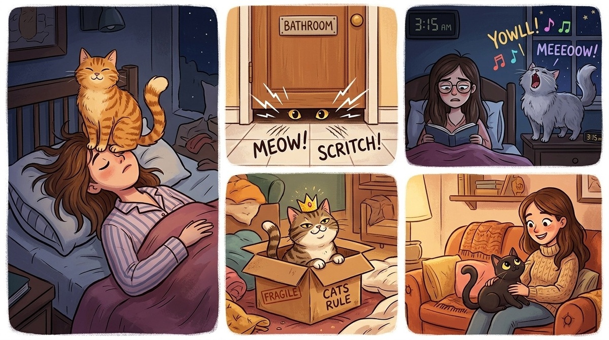 Потому что каждое утро кто‑то садится мне на голову. Потому что каждая коробка становится предметом торга. Потому что каждая закрытая дверь это объявление войны. Потому что каждую ночь кто‑то поёт. Не потому, что пришла муза. А потому что просто хочется. И это нормально.
