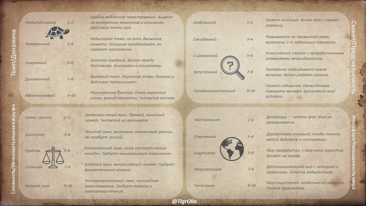 - Сюжет (предсказуемость) — интрига или ровное повествование, ведущее к логичному концу.