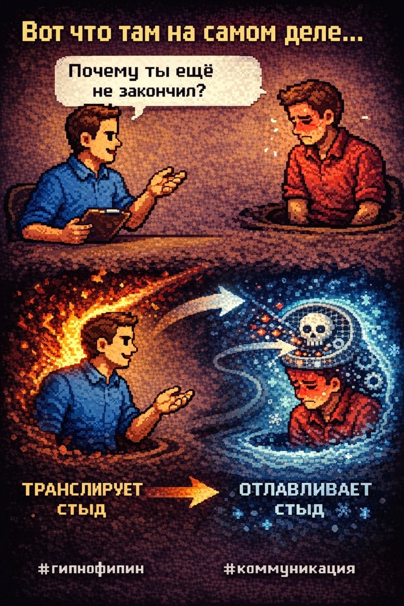 Второй краснеет и хочет провалиться 🕳️ Ни тот ни другой не понимают что произошло. Вот что там на самом деле. Есть люди, которые бессознательно формулируют так, что у собеседника включается стыд. Не специально 🎭 Не со зла. Просто у них такая манера — и они понятия не имеют что делают. Интонация, взгляд, пауза в нужном месте — и человек напротив уже чувствует себя маленьким. А есть другая ссторона. Люди, у которых фильтр восприятия настроен на стыд. Им можно сказать «привет» — и они найдут в этом подтекст. Что-то не то в голосе. Слишком коротко. Слишком холодно. Значит я что-то не так сделал 🧊 И вот эти двое встречаются. Один транслирует — не зная. Другой ловит — не проверяя. И оба уверены что всё очевидно 🔬 Самое интересное — это не про «кто виноват». Это про то что ни один из них не видит механику. Один не слышит как звучит. Другой не замечает свой фильтр 💀 А когда замечаешь — общение становится совсем другим 🔮 #гипнофилин #коммуникация