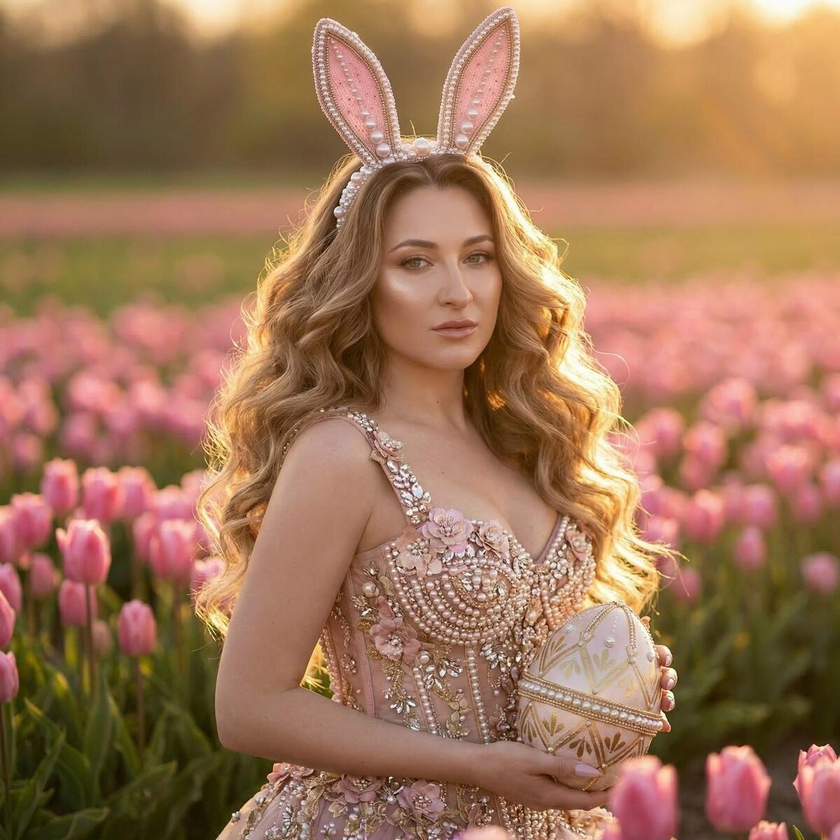 Модель: Nano Banana Сгенерировать🪄 Фотореалистичный fashion‑портрет в стиле вог, vertical 9:16, девушка с референсной фотографии модно позирует в поле розовых тюльпанов, кадр по пояс/по грудь, лёгкий разворот корпуса, взгляд в камеру. Безупречный вечерний макияж, хайлайтер, естественное сияние кожи. Волосы обьемные длинные волнистые и рассыпчатые, по контуру виднеется свечение от заходящего солнца. На голове роскошный ободок с высокими розовыми кроличьими ушами, декор бисером и жемчугом. Haute couture платье/корсет, полностью расшитый жемчугом, кристаллами и цветочными аппликациями в розово‑золотой гамме, сияющая фактура. В руках большое декоративное пасхальное яйцо, расписанное золотыми узорами и жемчужными элементами. Мягкий свет, золотой час, журнальная модная съемка , пастельная цветокоррекция, dreamy mood, shallow depth of field, нежное боке, высокая детализация тканей и украшений, editorial fashion, ultra realistic. Canon EOS R5, 85 mm, 8k NEGATIVE: текст, надписи, watermark, л