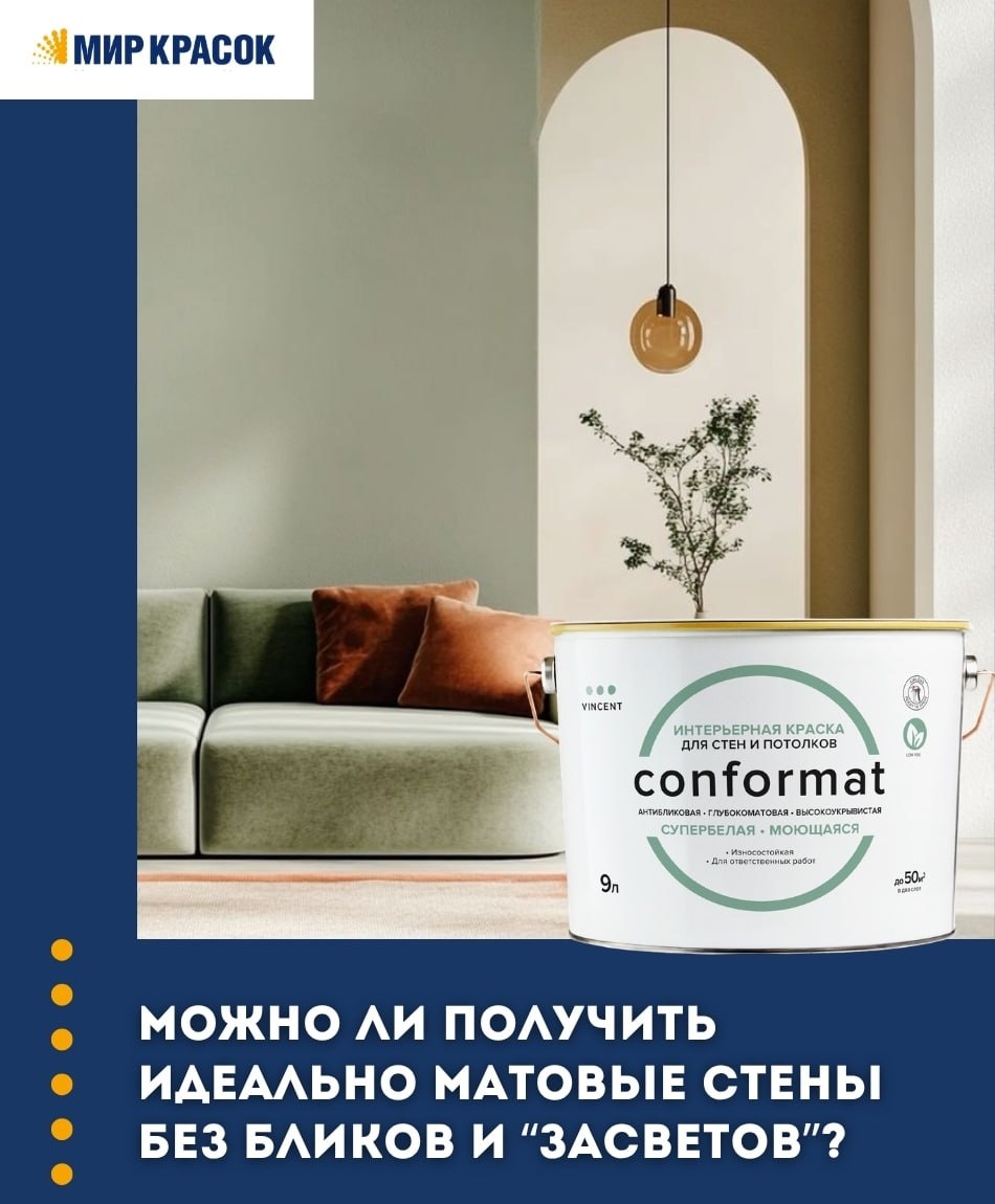 ”?🤔 Иногда интерьеру не нужны яркие акценты. Ему нужна глубина. Спокойствие.🕊Чистый, благородный фон, который не отвлекает, а подчёркивает пространство. VINCENT CONFORMAT — интерьерная антибликовая глубокоматовая краска, созданная для тех, кто ценит эстетику «евроремонта» и долговечность в одном решении🎨 📌Главное ощущение от этого покрытия — мягкость. Антибликовая формула убирает резкие отражения света, поэтому стены выглядят ровными и спокойными даже при ярком освещении. Глубокоматовая текстура визуально скрывает мелкие неровности и создаёт эффект дорогой бархатистой поверхности. Но за эстетикой стоит серьёзная техническая база. Vincent Conformat образует прочное «дышащее» покрытие, устойчивое к действию моющих средств и раствора хлорамина «Б». Оно выдерживает не менее 15 000 циклов мокрого трения — это особенно важно для квартир, офисов, детских садов, школ и медицинских учреждений🏠 📌Краска обладает высокой адгезией, в том числе к ранее окрашенным алкидной краской поверхно