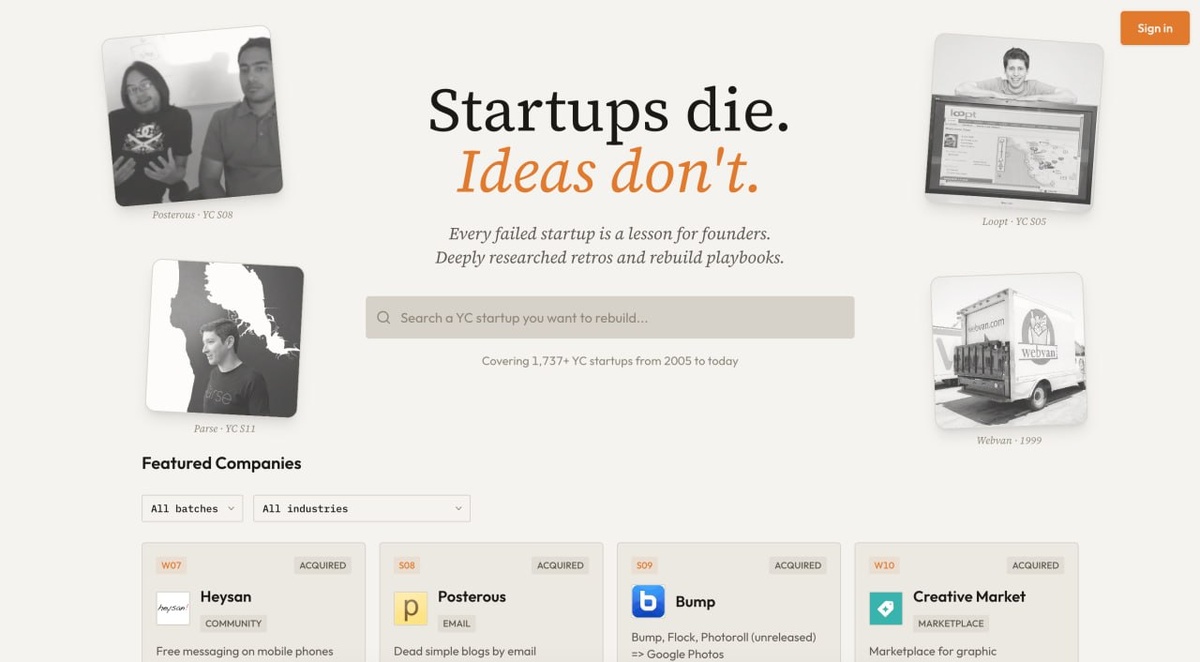 Нашёл для вас базу 1700+ YC-проектов с 2005, которые провалились или ушли в закат. Для каждого есть пост-мортем, объяснение почему рухнуло, и готовый план перезапуска на 2026 tech. Внутри глубокий разбор, playbook на Claude/Cursor/Lovable, tech-spec. Возможно, именно тут вы найдёте идею на миллион, которую сможете реализовать и продать сегодня: https://startups.rip/ @tproger Читайте также в VK, Max и Дзен