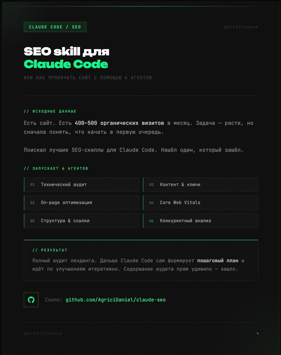 Исходник: ~400-500 визитов в месяц. Задача — расти. Но сначала понять, что качать на лендинге в первую очередь. Поискал лучшие SEO-скиллы для Claude Code, нашёл кмк классный. Запускаешь аудит → он поднимает 6 агентов, каждый со своей специализацией: техничка, контент, on-page, Core Web Vitals, структура, конкуренты. На выходе — полный аудит. Содержание реально удивило. Дальше Claude Code сам формирует пошаговый план и идёшь по улучшениям итеративно. Скилл: github.com/AgriciDaniel/claude-seo 📱 Макс 📖 Дзен ✈️ Telegram