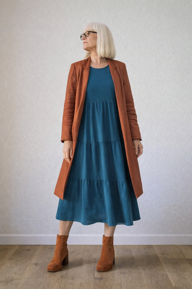 Первый образ у меня вызывает скорее тёплую реакцию. Он мягкий, спокойный, но не бесхарактерный. Бирюзовое платье само по себе довольно объёмное: ярусы, длина миди, свободная форма. Такие вещи легко уходят в бесформенность, особенно если сверху добавить ещё что-то расслабленное. Но здесь длинный терракотовый верхний слой как раз удерживает силуэт и даёт ему вертикаль.
