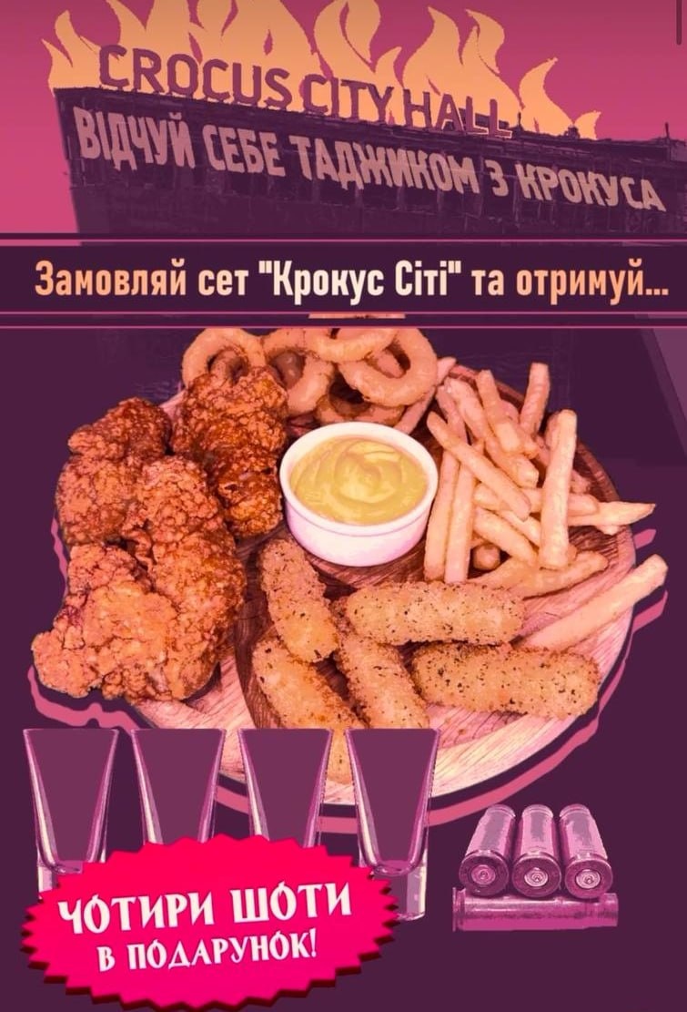 ». Заведение предлагает посетителям купить сет закусок «Крокус Сити», к которому в подарок идут четыре алкогольных шота — по числу террористов. В рекламном посте бар назвал теракт «невероятно смешным событием» и призвал украинцев праздновать его. Заведение работает с 2023 года, не имеет никаких возрастных ограничений и называет себя «первым военно-художественным баром в Киеве». 🤬 — самый бездушный бар мира ⭕️ Плохо грузятся посты? Читайте в MAX!