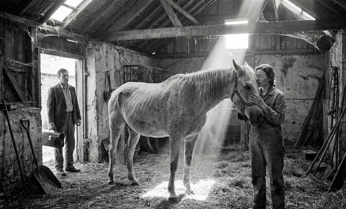 Свет выхватил из мрака сначала стены, покрытые плесенью, потом сломанные ясли, потом ворох гнилого сена на полу. А потом — его. В дальнем углу, привязанный короткой верёвкой к ржавому кольцу в стене, стоял конь. Ольга не сразу поняла, что это живое существо. Он был огромен — порода, видимо, была крупной, рабочей лошадью, которую держали для хозяйства, но сейчас от величия не осталось ничего. Каждый позвонок выпирал из-под серой, свалявшейся шерсти так явно, что казалось, кожа вот-вот лопнет. Рёбра торчали частоколом. Голова его низко свисала к земле, грива слиплась в колтуны, а глаза... Ольга подошла ближе, и её сердце сжалось так, что на миг перехватило дыхание. Глаза коня были затянуты пеленой такого полного, абсолютного равнодушия, какого она никогда не видела даже у самых больных своих подопечных. Он смотрел сквозь неё, сквозь стены, сквозь время. Он уже сдался. Он уже умер внутри, а тело по инерции продолжало стоять на тощих ногах, которые дрожали под тяжестью его собственного скелета.