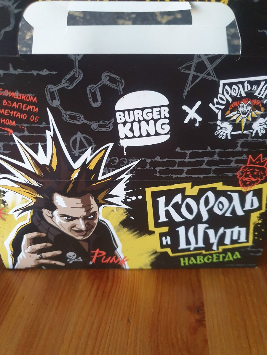 Всё-таки Король и Шут - это не просто группа, а культурный феномен, который упрямо не желает умирать, как герой их же мрачных баллад, восстающий из склепа и ведущий за собой гопников - зомби. И теперь их аккуратно, но настойчиво раздирают на сувениры и рекламные кампании. Вчера мы были в торговом центре и зашли в Burger King. Я эту сеть не люблю - на вкус все блюда разной степени пластиковости, - но надо отдать должное: их маркетинг работает как хороший панк-концерт - бьёт в лицо и не извиняется. Помните эти прекрасные провокации? "Накорми тарелочницу", "Цыпочки в твоём вкусе", "Она скажет “да”. После рекламной компании прокатилась волна возмущений, в основном, со стороны женщин. В Burger King отказались извиняться за провокационные названия - молодцы, считаю. Обиженок обоего пола не люблю. А как вам "Раскурячь их всех"? Или "Налижемся прямо сейчас". И да, мы все немного окурели от такого креатива. И вот теперь Burger King решил "приобщать" народ к панк-культуре. Появился набор "Корол