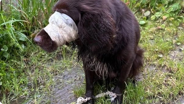 Собака металась из стороны в сторону, натыкаясь на деревья, на кусты, на землю. Вся её морда была обмотана грязными тряпками — так туго, что глаза полностью скрыты, пасть стянута, только нос торчит наружу. Она дышала хрипло, судорожно, хватала воздух, как утопающий.
