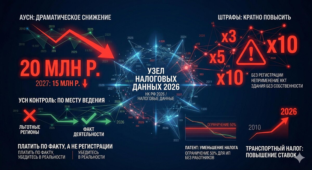 2026 году. Скажу честно — новости безрадостные, закручивание гаек коснется в первую очередь малого бизнеса. Я выделила главные тревожные сигналы: ▫️ Драматическое снижение лимита доходов по АУСН : на дворе 2026 год, и если эти изменения примут, то лимит за текущий год составит всего 20 млн рублей (а в 2027 году он может снизиться до 15 млн). Режим становится почти бессмысленным для растущих компаний. ▫️ Жесткий контроль по УСН : платить налог придется по месту фактического ведения деятельности, а не по месту регистрации. Это удар по любителям регистрироваться в "льготных" регионах. Убедитесь, что ваша регистрация соответствует реальности. ▫️ Кратно повысить штрафы : за работу без регистрации ИП/юрлица, неприменение ККТ (кассы), использование зданий без регистрации собственности. Ожидается тотальная проверка уже сейчас. ▫️ Ударить по Патенту : хотят распространить ограничение в 50% на уменьшение налога за счет страховых взносов и на ИП без работников. ▫️ Поднять ставки транспортно