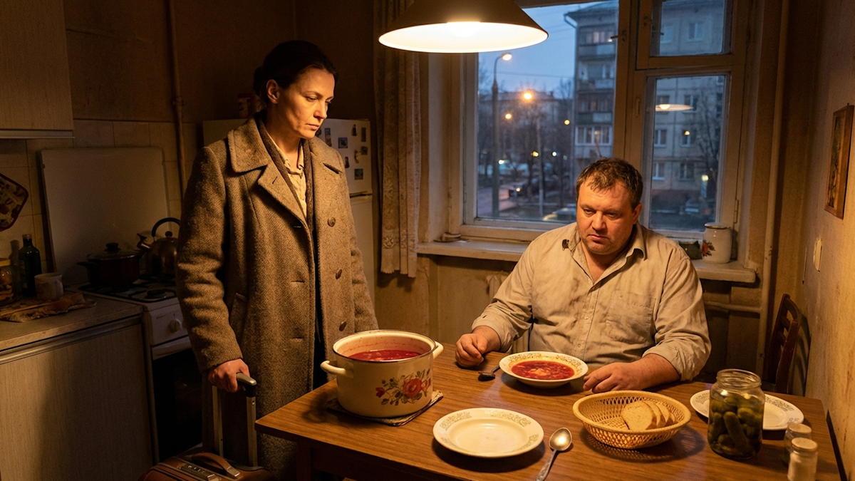 Игорь застыл. Смотрел то на тарелку, то на чемодан. Не нашёлся ни слова сказать, ни закричать - просто сидел и смотрел, как она надевает пальто, берёт ручку чемодана и выходит за дверь.