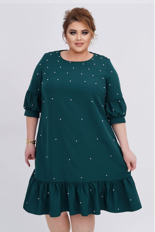 Свободный крой и рукава с объёмной сборкой скрывают недостатки и подчёркивают достоинства фигуры. Украшение в виде аккуратных страз добавляет платью праздничности и утончённости, а волан по низу создаёт лёгкий и женственный силуэт. Глубокий зелёный цвет смотрится благородно и легко сочетается с аксессуарами.