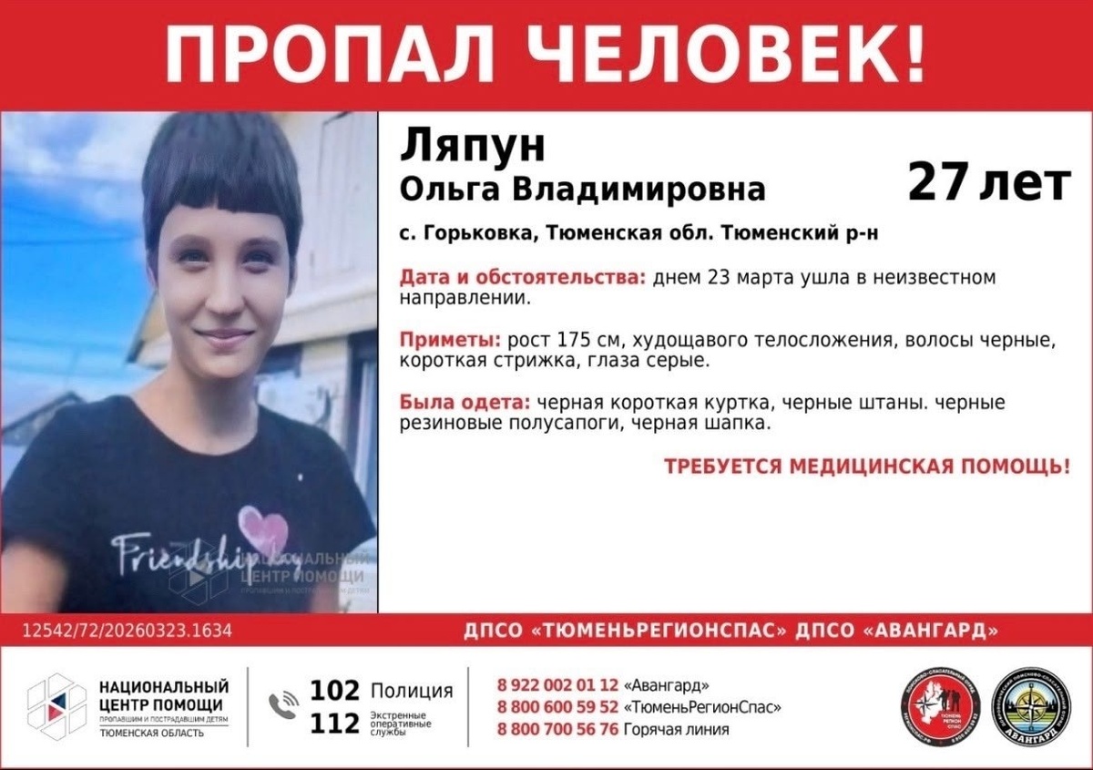 ‼️ Может находится в вашем районе! ФИО: Ляпун Ольга Владимировна, 27 лет. Дата пропажи: 23.03.2026г. Место пропажи: село Горькова, Тюменский район Приметы: Рост: 175 см Телосложение: худощавое Волосы: черные, короткие Глаза: серые Была одет: черная короткая куртка, черные штаны со светло-зелеными лампасами, черные резиновые полусапоги(одежда выглядит неопрятно) Всем, кому что либо известно о место нахождении пропавшего, а так же если вы располагаете информацией о пропавшем, огромная просьба звонить инфогру поиска Наталье «Белка» 89220478461, на горячую линию поискового отряда 8(922)0020112 или 112 АНОНИМНОСТЬ ГАРАНТИРУЕТСЯ! Требуется помощь в максимальном распространении информации по сетевым ресурсам! 🙏