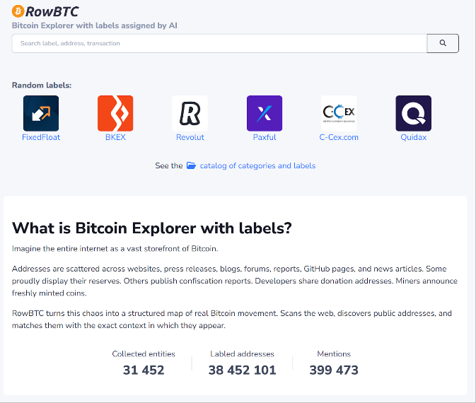 На текущий момент в хранилище RowBTC содержится свыше 38 452 101 размеченного адреса и 31 452 объекта (компаний и организаций), оснащенных токенами идентификации. Кроме того, задокументировано 399 473 упоминания адресов, найденных в публичных источниках. Сбор данных и разметка с помощью ИИ