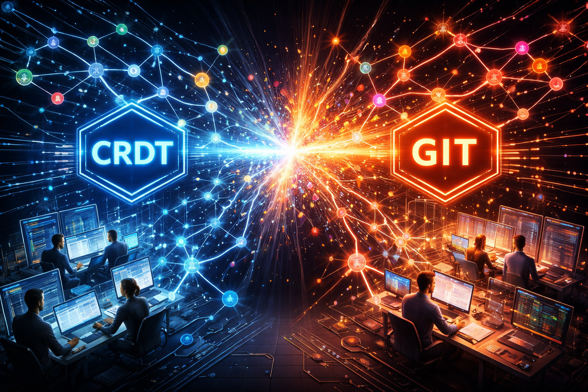 Но до сих пор никто не довёл применение CRDT в контроле версий до убедительной демонстрации. Были отдельные исследования (Automerge Мартина Клеппмана, эксперименты Ink & Switch), но камнем преткновения оставался UX: если мерж никогда не «ломается», то как показать разработчику, что что-то всё-таки требует его внимания?