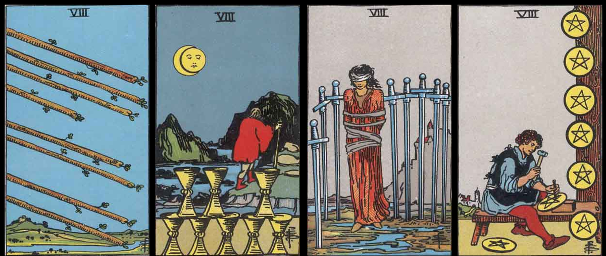 Восьмерки в таро это про движение вперед и активный процесс. Восьмерка Жезлов — стремительные события, быстрые перемены, резкое ускорение. Восьмерка Кубков — уход от того, что не удовлетворяет, поиск нового, движение вперед. Восьмерка Пентаклей — активная работа, прогресс, движение к конкретному результату. И только восьмерка Мечей, казалось бы, не вписывается в эту активность, ведь 8 мечей — это тупик, ограничения, скованность. Но давайте разберем так ли это на самом деле?! Давай посмотрим, как другие масти справляются с энергией числа 8, чтобы понять, почему у Мечей всё пошло не так. 1. Восьмерка Жезлов (Огонь): Огонь обожает скорость. Для него 8 — это идеально. Стрелы летят, ничего их не останавливает. Чистый экстаз движения. 2. Восьмерка Кубков (Вода): Вода тоже может течь быстро. Но Восьмерка Кубков — это осознанное движение. Вода решает: "Здесь я не чувствую удовлетворения — и уходит. Это грусть, но это свободный выбор. 3. Восьмерка Пентаклей (Земля): Земля медленная. Для нее 8 —