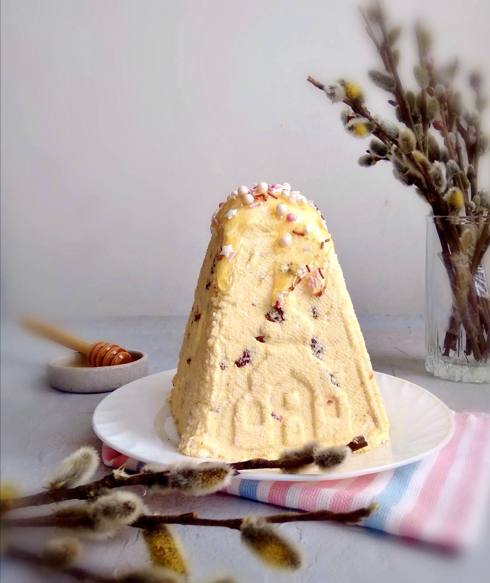 Ингредиенты: ▫️ творог жирный — 500 г ▫️ сливочное масло — 100 г ▫️ мед — 120 г ▫️ морковь вареная — 2 шт. ▫️ апельсиновая цедра — 2 ст. л. ▫️ сметана 20% — 2 ст. л. ▫️ изюм без косточек — 100 г Способ приготовления: 1. Подготовить все продукты. Морковь натереть на терке, цедру тоже. Изюм замочить в воде на 15 минут, затем промыть и обсушить бумажным полотенцем. 2. Размягченное масло и творог пробить немного блендером. 3. Добавить цедру, морковь, сметану и пробить еще раз. 4. Влить мед, пробить блендером. 5. Добавить изюм, перемешать ложкой. 6. Вот такая масса получается. 7. Форму застелить марлей, переложить массу в форму. Накрыть краями марли, сверху поставить груз. Форму поставить в миску, чтобы стекла лишняя жидкость. 8. Убрать в холодильник на ночь. 9. Аккуратно перевернуть форму на тарелку. Снять марлю. Украсить по вкусу. 10. Можно полить медом и украсить посыпками. 11. Получается нежная, в меру сладкая и очень ароматная пасха. Приятного аппетита!