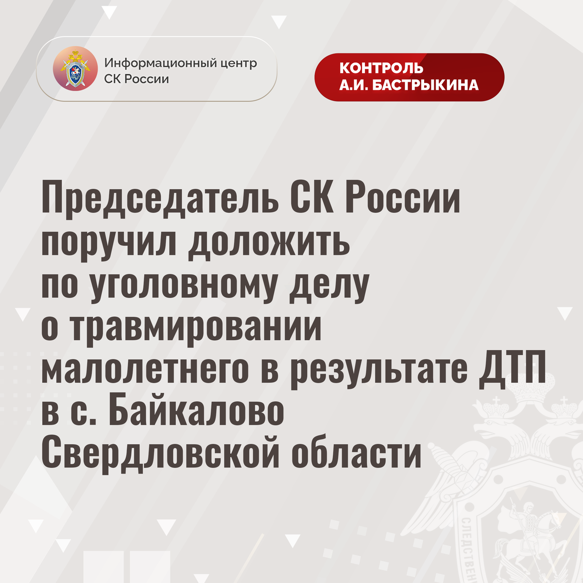 Председатель СК России поручил доложить по уголовному делу о травмировании малолетнего в результате дорожно-транспортного происшествия в с. Байкалово Свердловской области К Председателю СК России А.И. Бастрыкину через Информационный центр обратилась жительница Свердловской области по вопросу несогласия с ходом установления обстоятельств травмирования ее девятилетнего сына в результате дорожно-транспортного происшествия в селе Байкалово. В октябре прошлого года женщина, управляя легковым транспортным средством, сбила мальчика, передвигавшегося на велосипеде. Пострадавшего госпитализировали, у него диагностированы травмы, ему потребовалось оперативное вмешательство. Отмечается, что виновница аварии своевременно не вызвала бригаду скорой медицинской помощи. До настоящего времени никто к ответственности не привлечен. В СУ СК России по Свердловской области возбуждено уголовное дело. Председатель Следственного комитета Российской Федерации Александр Иванович Бастрыкин поручил руководителю С