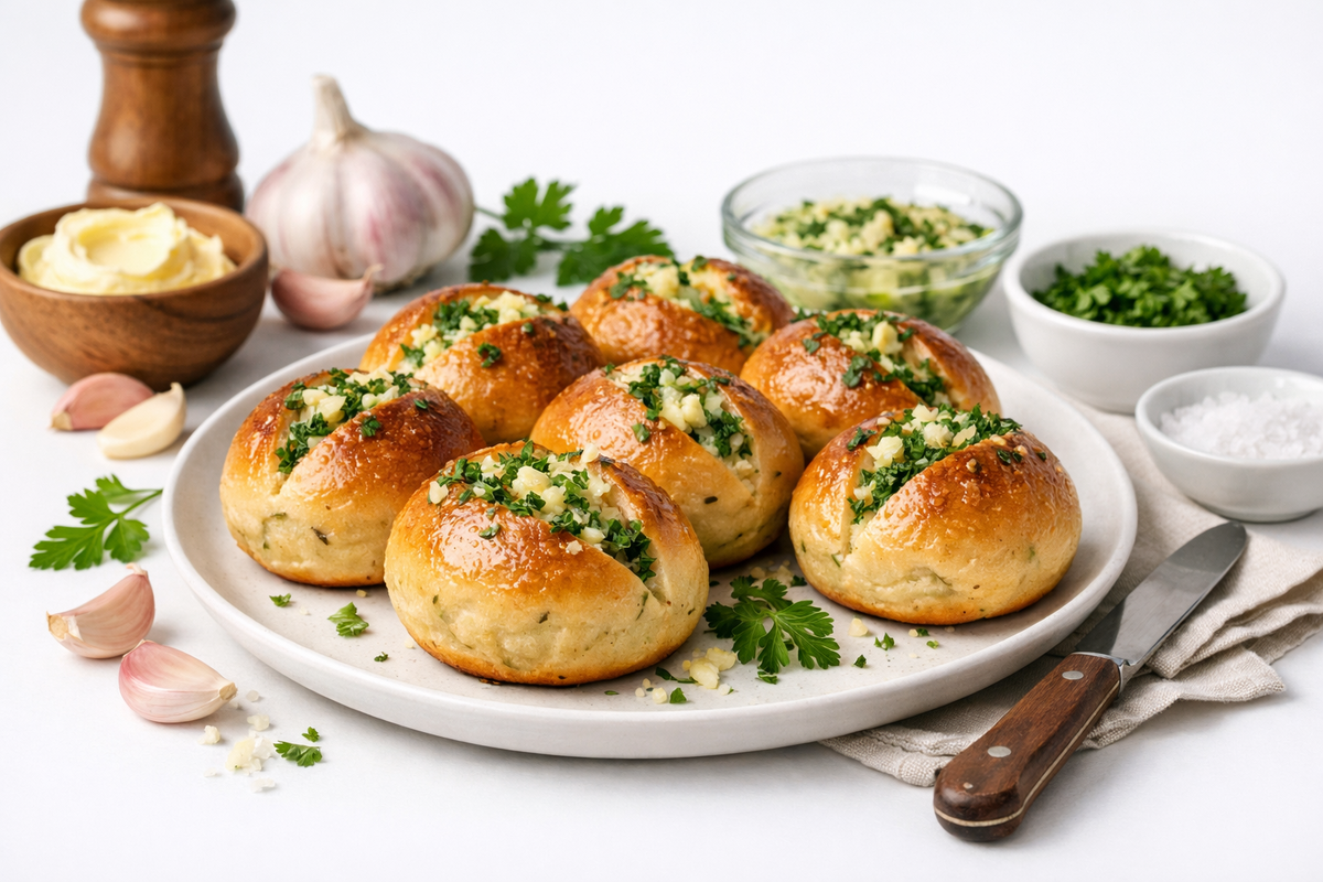 Подаю их тёплыми, прямо в форме или на деревянной доске. Рядом хорошо поставить сметанный соус, тарелку супа или просто свежие овощи. Домашняя выпечка с чесноком и зеленью всегда собирает всех без лишних приглашений.