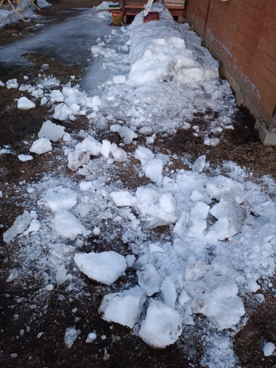 И традиционная в эти дни процедура — разбросать снег\лёд с куч. Чтоб быстрей таял. По чуть-чуть делаю. Всё за раз сил и времени не хочу на это тратить. А так, перед ужином, перед заходом в дом, можно раз 50 вбить лопату и после взмахнуть ею груженной тяжеленым куском в сторону.