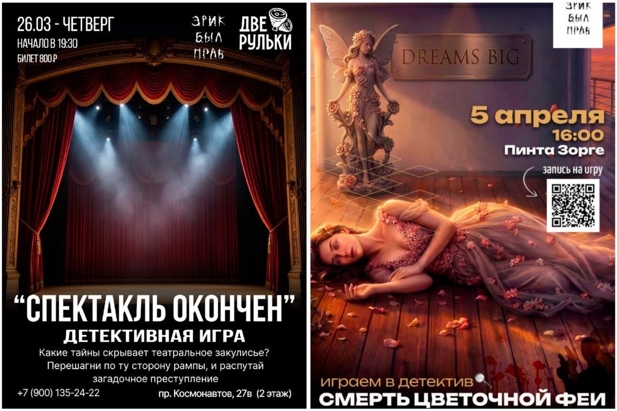 ! ⏰️ 26 марта (четверг) в 19.30 Ресторан "Две рульки" (пр.Космонавтов, 27 в) играем в детективную игру "Спектакль окончен" Регистрация- https://forms.yandex.ru/u/699b6f81eb6146e045790ab4 ⏰️ 5 апреля (воскресенье) в 16.00 "ПИНТА- западный" (ул.Зорге, 64 б) Играем в детективную игру "Смерть Цветочной феи" Регистрация- https://forms.yandex.ru/u/69bbc55149af47319fcc327e Стоимость игры- 800р/чел. Продолжительность игры -2 часа Приглашаем команды от 2-х и до 10 чел. Организатор #эрикбылправ