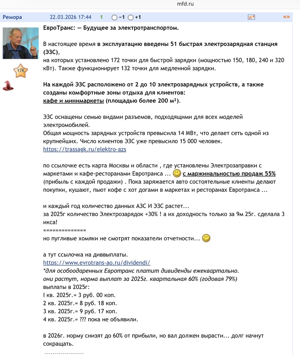 Несмотря на то, что акции и облигации ПАО «ЕвроТранс» уже несколько месяцев находятся в пике: нашлись деятели подхватившие песню: Вот типичный вброс с профильной ветки форума mfd.ru: Хотя я все-таки неправильно поставил акценты. Появились такие вбросы не «несмотря», а «в следствии». Ведь когда бумаги падают камнем, нужно найти чудаков, о которых следует разгрузиться. Вот в информационном пространстве и зашевелилась разная падаль. Я передал обсуждение за один день на ветке «ЕвроТранса» в ИИ (Copilot) и попросил сделать анализ. Беспристрастный ИИ выдал следующую картину: В дальнейшем я еще опубликую описание токсичности и манипулятивности данных персонажей. А пока пожелание читателям: Удачи и трезвого анализа в ваших инвестициях!!! P.S. Подписывайтесь на мой телеграмм-канал: https://t.me/Cervonets