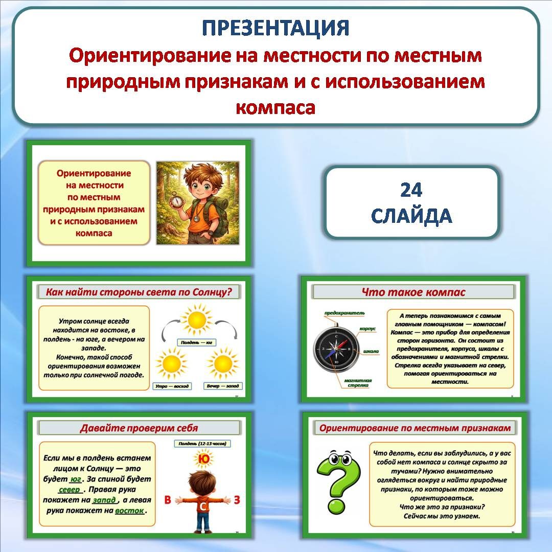 Презентацию скачать здесь Возможно, вам пригодится конспект урока. Конспект урока скачать здесь Презентация «Ориентирование на местности по местным природным признакам и с использованием компаса» разработана к уроку окружающего мира во 2 классе. Презентация состоит из 24 слайдов. Содержание презентации: Слайд № 1. Титульный слайд. Слайд № 2. О чём сегодня узнаем? Слайд № 3. Что такое ориентирование на местности? Слайд № 4. Зачем нужно уметь ориентироваться? Слайд № 5. Основные способы ориентирования. Слайд № 6. Основные стороны горизонта. Слайд № 7. Промежуточные стороны горизонта. Слайд № 8. Что такое компас. Слайд № 9. Это важно! Слайд № 10. Как пользоваться компасом? Слайд № 11. Что не терпит компас? Слайд № 12. Как найти стороны света по Солнцу? Слайды № 13-14. Давайте проверим себя. Слайд № 15. Ориентирование по тени. Слайды № 16-20. Ориентирование по местным признакам. Слайд № 21. О чём важно помнить при ориентировании по местным признакам? Слайд № 22. Какие знания ещё пригодятся