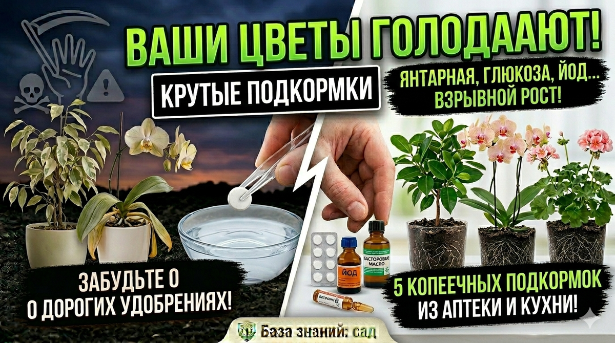 Многие думают, что домашним цветам достаточно просто воды. Но горшок — это замкнутая экосистема, где земля истощается уже через 2–3 месяца после посадки. Растение начинает «поедать» само себя: нижние листья желтеют, стебли вытягиваются, а бутоны осыпаются, так и не раскрывшись. Умоляю, не тратьте тысячи на импортные флаконы! Всё, что нужно для пышного цветения, уже есть в вашей аптечке или на кухонной полке. Вот 5 рецептов, которые работают как «живая вода». Это настоящий «энергетик» для растений. Она не просто кормит, она заставляет корни работать на 200%. Если цветок замер и не дает новых побегов, ему не хватает углеводов. Глюкоза — это строительный материал для клеток. Витамины B_{1}, B_{6} и B_{12} — это секретное оружие для тех, кто хочет добиться цветения орхидей, герани или декабриста. Если ваш цветок нарастил огромную зеленую массу, но не дает бутонов, дайте ему «волшебный пинок» касторкой. Йод не только стимулирует рост, но и защищает от грибков и гнилей, которые