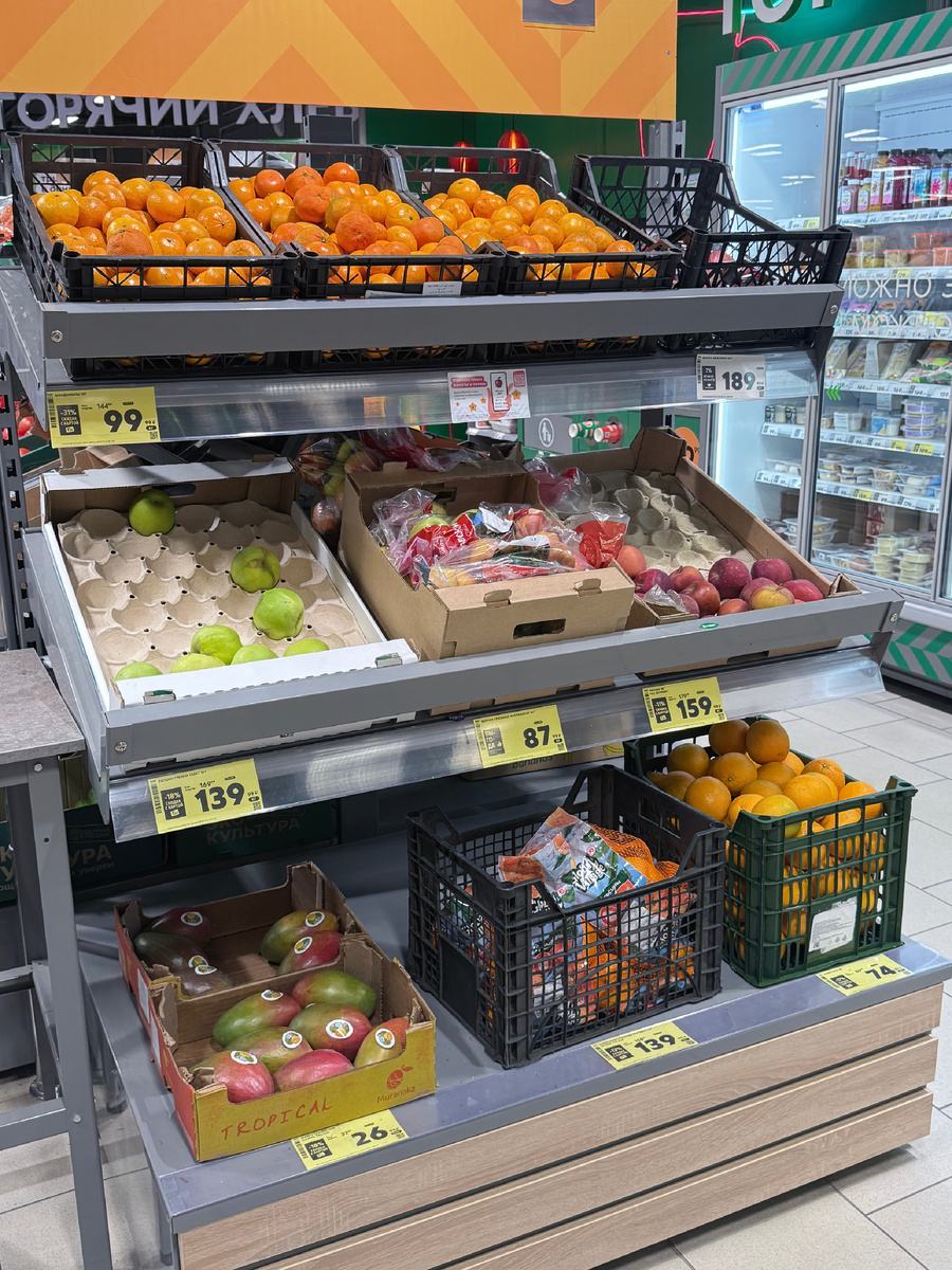 Начну по традиции с овощного отдела. Ассортимент сейчас неплохой: есть мандарины (от 99 ₽) и яблоки (от 87 ₽ за кг). Радует, что всё выглядит свежо и аппетитно. Из экзотики завезли манго по 260 ₽ за килограмм.