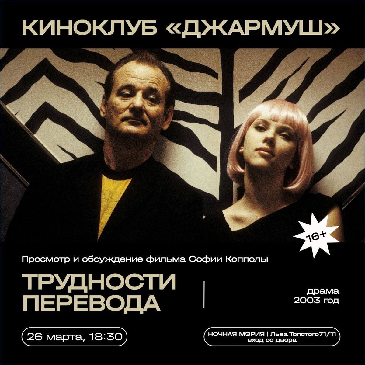 + 🗓️ 26 марта, 18:30 📍Креативное пространство "Пентхаус", Федерации 25, вход со двора Льва Толстого 71/11 (вход со двора) «Трудности перевода» — американский художественный фильм 2003 года режиссёра Софии Копполы. Экзистенциальная мелодрама, в которой Билл Мюррей исполняет роль Боба Харриса, увядающей американской кинозвезды, переживающей кризис среднего возраста, когда он отправляется в Токио для рекламы виски Suntory. Там он начинает дружить с другой американкой по имени Шарлотта, молодой женщиной и недавней выпускницей колледжа в исполнении Скарлетт Йоханссон. Лента собрала четыре номинации на премию «Оскар», но победила всего в одной — «Лучший оригинальный сценарий». Девятнадцатилетняя Скарлетт Йоханссон и Билл Мюррей получили награду Британской академии в категориях «Лучшая актриса» и «Лучший актёр» соответственно. Ведущий киноклуба: Павел Солдатов. 🏷Вход — свободные взносы #26марта26@culturnik 🕊️пойду • ❤️ нравится • ✅рекомендую